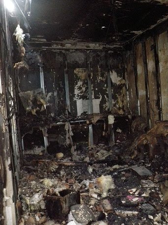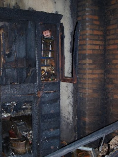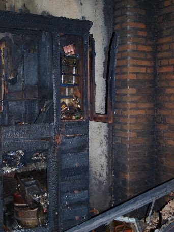 This is, or should I say, was my office, where the fire started. To the right is Bunny’s “house”, look at the blue pot; there is not even any smoke damage! The fire completely melted the radiator that was under that window!